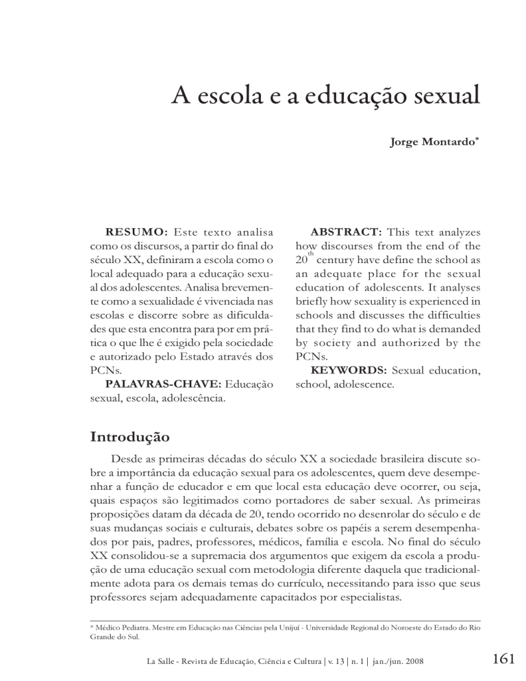Aescolaeaeducaçãosexual Jorge Montardo* RESUMO: Este texto analisa como os discursos, a partir do final do século XX, definiram a escola como o local adequado para a educação sexual dos adolescentes. Analisa brevemente como a sexualidade é vivenciada nas escolas e discorre sobre as dificuldades que esta encontra para por em prática o que lhe é exigido pela sociedade e autorizado pelo Estado através dos PCNs. PALAVRAS-CHAVE: Educação sexual, escola, adolescência. ABSTRACT: This text analyzes how discourses from the end of the th 20 century have define the school as an adequate place for the sexual education of adolescents. It analyses briefly how sexuality is experienced in schools and discusses the difficulties that they find to do what is demanded by society and authorized by the PCNs. KEYWORDS: Sexual education, school, adolescence. Introdução Desde as primeiras décadas do século XX a sociedade brasileira discute sobre a importância da educação sexual para os adolescentes, quem deve desempenhar a função de educador e em que local esta educação deve ocorrer, ou seja, quais espaços são legitimados como portadores de saber sexual. As primeiras proposições datam da década de 20, tendo ocorrido no desenrolar do século e de suas mudanças sociais e culturais, debates sobre os papéis a serem desempenhados por pais, padres, professores, médicos, família e escola. No final do século XX consolidou-se a supremacia dos argumentos que exigem da escola a produção de uma educação sexual com metodologia diferente daquela que tradicionalmente adota para os demais temas do currículo, necessitando para isso que seus professores sejam adequadamente capacitados por especialistas. * Médico Pediatra. Mestre em Educação nas Ciências pela Unijuí - Universidade Regional do Noroeste do Estado do Rio Grande do Sul. LaSalle-RevistadeEducação,CiênciaeCultura|v.13|n.1|jan./jun.2008 161 MONTARDO,Jorge A família, considerada há muito tempo como o local ideal para a intervenção de ações religiosas, médicas, políticas e econômicas, também foi envolvida no processo de educação sexual, tendo sido durante algum tempo definida por alguns discursos como o único local adequado para a orientação dos filhos. Os padres católicos foram os principais defensores da família como educadora sexual e o padre Negromonte (1951) classificava os pais que abdicassem dessa função de imprudentes ou comodistas, pois ao cederem este papel a outros, estavam expondo seus filhos a mestres considerados incapazes ou até mesmo nocivos. A partir dos anos 80, os discursos favoráveis à consolidação da escola como local para a educação sexual e à necessidade de formação de professores para desenvolverem programas nesta área deslocaram a família para um papel de coadjuvante. Neste sentido, ocorreu a descaracterização da competência dos pais como educadores sexuais e a família não apenas perdeu a autonomia sobre a sexualidade de seus filhos, como foi responsabilizada por enviar às escolas alunos desinformados e com atitudes negativas em relação ao sexo. A escola foi definida como o local adequado para reverter a carga de tabus, os preconceitos, os conflitos, os sentimentos de culpa e as dúvidas dos alunos: Parece-nos claro que a melhor educação seria a que fosse propiciada pelos próprios pais, pois nenhuma estrutura social consegue atuar tão precocemente, com adultos tão significativos, por tanto tempo e de forma tão importante sobre o ser humano em sua fase de formação de personalidade, como a família. No entanto, como regra geral, os pais têm notória dificuldade em falar de sexo com os seus filhos. [...] São dificuldades de cunho cultural, que somente serão superadas com muito esforço pessoal e grandes lutas internas pois nós, adultos, somos filhos de nosso meio e de nossa época, sendo ao mesmo tempo agentes e vítimas dos preconceitos vigentes. Assim sendo, pelas dificuldades enfrentadas pelos pais, somos obrigados a nos valer do ensino formal, que nos parece ser, a médio e longo prazo, a solução mais viável no momento histórico que nossa sociedade está vivendo (VITIELLO, 1997, p. 101-2). Além da alegada incompetência dos pais, surgiram outros argumentos em detrimento da família. Um deles é defendido por Suplicy (2000, p. 33) ao caracterizar a adolescência como problema e durante a qual normalmente a família se constitui num lugar de tensão e conflito, dificultando a abordagem de certos assuntos pelos pais, os quais poderiam ser discutidos na escola com mais liberdade. Assim, de certo modo destituídos da função de educadores sexuais de seus filhos, os pais se convenceram de sua incapacidade e da necessidade de terceirizarem a educação sexual de seus filhos, levando-os a confirmarem em pesquisas que preferem que a escola assuma essa função. A escola foi então convocada para elaborar uma educação sexual para seus alunos, atuando sobre indivíduos que trazem para a sala de aula muitas marcas sobre sexualidade que se constituíram a partir de suas famílias e que evidenciam uma heterogeneidade que esta mesma escola vai ter dificuldade em harmonizar. 162 LaSalle-RevistadeEducação,CiênciaeCultura|v.13|n.1|jan./jun.2008 Aescolaeaeducaçãosexual A sua função é difícil, pois a sociedade exige que nesta tarefa a escola precisa se equilibrar sobre um fio muito tênue: de um lado incentivar a sexualidade normal e, de outro, simultaneamente, contê-la (LOURO, 2001, p. 26). A sexualidade na escola Na escola, professores e alunos vivenciam as questões sexuais de múltiplas formas. Uma delas é invisível numa análise superficial, e, por isso mesmo, geralmente não associada às suas conseqüências. É por esta forma que o sistema educacional se empenha em transformar seus alunos em homens e mulheres de verdade, formatados dentro de conceitos estritos de masculinidade e feminilidade e preocupados em não se desviarem das normas estabel