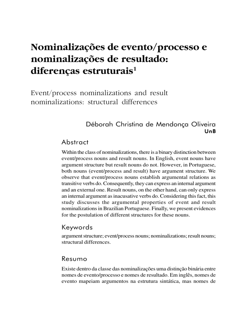 Nominalizações de evento/processo e nominalizações de resultado: diferenças estruturais1 Event/process nominalizations and result nominalizations: structural differences Déborah Christina de Mendonça Oliveira UnB Abstract Within the class of nominalizations, there is a binary distinction between event/process nouns and result nouns. In English, event nouns have argument structure but result nouns do not. However, in Portuguese, both nouns (event/process and result) have argument structure. We observe that event/process nouns establish argumental relations as transitive verbs do. Consequently, they can express an internal argument and an external one. Result nouns, on the other hand, can only express an internal argument as inacusative verbs do. Considering this fact, this study discusses the argumental properties of event and result nominalizations in Brazilian Portuguese. Finally, we present evidences for the postulation of different structures for these nouns. Keywords argument structure; event/process nouns; nominalizations; result nouns; structural differences. Resumo Existe dentro da classe das nominalizações uma distinção binária entre nomes de evento/processo e nomes de resultado. Em inglês, nomes de evento mapeiam argumentos na estrutura sintática, mas nomes de 492 OLIVEIRA resultado não. Entretanto, em português, os dois tipos de nome (evento/ processo e resultado) podem mapear argumentos na estrutura sintática. Observa-se que os nomes de evento/processo, por um lado, estabelecem relações argumentais semelhantes às dos verbos transitivos. Conseqüentemente, esses nomes podem expressar um argumento interno e um externo. Nomes de resultado, por outro lado, podem expressar somente um argumento interno semelhantemente aos verbos inacusativos. Considerando-se tal fato, o presente estudo discute as propriedades argumentais das nominalizações de evento e de resultado no português do Brasil. Por fim, apresentamos evidências para a postulação de estruturas diferentes para esses nomes. Palavras-chave diferenças estruturais; estrutura argumental; nomes de evento/processo; nomes de resultado; nominalizações. Rev. Est. Ling., Belo Horizonte, v. 14, n. 2, p. 491-502, jun./dez. 2006 493 1. INTRODUÇÃO O presente trabalho tem como objetivo central verificar as diferenças observadas no mapeamento da estrutura argumental de nominalizações de evento/processo e de nominalizações de resultado no português (1) O planejamento da reforma da catedral preocupa os engenheiros. (2) O planejamento das aulas está na pasta branca. do Brasil. Estudos anteriores (BASÍLIO, 1980; ABNEY, 1987; GRIMSHAW, 1990) afirmam que as nominalizações são ambíguas por permitirem ora uma interpretação verbal, propriedade das nominalizações de evento/processo, conforme exemplo em (1), ora uma interpretação nominal, propriedade das nominalizações de resultado, conforme exemplo em (2). Como se pode observar, o nome planejamento em (1) remete ao processo de planejar algo; ao contrário, em (2) o nome planejamento referese ao resultado do evento de planejar. Dessa forma, pode-se afirmar que existe dentro da classe das nominalizações uma distinção binária entre nomes de evento/processo e nomes de resultado. A ambigüidade dessa classe de nomes se deve ao fato de estarem em relação paradigmática com verbos, o que os permite retomar o evento expresso pela forma verbal. A literatura (ABNEY, 1987; GRIMSHAW, 1990) tem apontado que, no inglês, essa distinção é marcada entre outras formas na estrutura argumental. Por um lado, nomes de evento/processo mapeiam argumentos na estrutura sintática e, por outro, nomes de resultado não apresentam tal propriedade, podendo apenas apresentar modificadores, como exemplificado a seguir: 494 OLIVEIRA (3) Reconstruction of the village will take several months. (4) The reconstruction can be destroyed in the fire. (5) Peter’s reconstruction can be destroyed in the fire. No exemplo (3), o nome reconstruction apresenta características de um nome de evento, com a expressão de um dos argumentos, mas em (4) e (5) apresenta características de um nome de resultado, sem o mapeamento de argumentos na sua estrutura sintática. O genitivo Peter’s em (5) não representa o argumento externo, esse elemento é interpretado como um possessivo, ou seja, um modificador. Observa-se, no entanto, que, no português do Brasil, tal distinção não se apresenta, visto que ambos os tipos de nomes podem mapear argumentos na estrutura sintática,2 como apresentado adiante na seção 3 deste trabalho. Observa-se, ainda, que nominalizações de evento/processo estabelecem relações argumentais da mesma forma que verbos transitivos, podendo selecionar ambos os argumentos, o que sugere para esses nomes uma estrutura do tipo transitiva. Ao contrário, nominalizações de resultado apresentam certas restrições quanto à saturação simultânea de ambos os argumentos, o que sugere para esses nomes uma estrutura do tipo inacusativa. Com base nisso, o presente trabalho tem como objetivo discutir as propriedades argumentais das nominalizações de evento/processo e das nominalizações de resultado no português do Brasil, bem como apresentar evidências para a postulação de estruturas distintas para tais nomes. A nossa conclusão caminha em direção à formulação de uma estrutura transitiva para nominalizações de evento/processo e de uma estrutura inacusativa para nominalizações de resultado, de forma a captar as diferenças observadas entre esses dois tipos de nominais. O trabalho está organizado em cinco seções: a seção 2 se destina a discutir as nominalizações em inglês a fim de contrastar com o comportamento das nominalizações em português, a seção 3 apresenta uma proposta de minha autoria para o mapeamento argumental das nominalizações em português, a seção 4 trata das diferenças estruturais entre os dois tipos de nominalizações no po