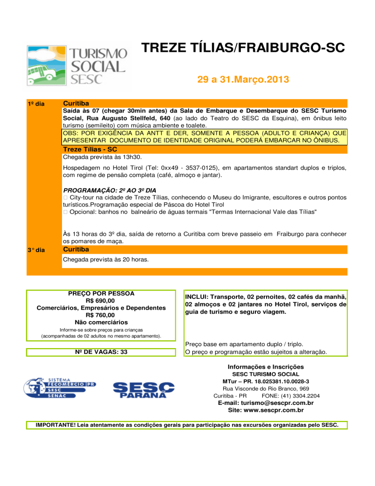 TREZE TÍLIAS/FRAIBURGO-SC 29 a 31.Março.2013 1º dia Curitiba Saída às 07 (chegar 30min antes) da Sala de Embarque e Desembarque do SESC Turismo Social, Rua Augusto Stellfeld, 640 (ao lado do Teatro do SESC da Esquina), em ônibus leito turismo (semileito) com música ambiente e toalete. OBS: POR EXIGÊNCIA DA ANTT E DER, SOMENTE A PESSOA (ADULTO E CRIANÇA) QUE APRESENTAR DOCUMENTO DE IDENTIDADE ORIGINAL PODERÁ EMBARCAR NO ÔNIBUS. Treze Tílias - SC Chegada prevista às 13h30. Hospedagem no Hotel Tirol (Tel: 0xx49 - 3537-0125), em apartamentos standart duplos e triplos, com regime de pensão completa (café, almoço e jantar). PROGRAMAÇÃO: 2º AO 3º DIA City-tour na cidade de Treze Tílias, conhecendo o Museu do Imigrante, escultores e outros pontos turísticos.Programação especial de Páscoa do Hotel Tirol Opcional: banhos no balneário de águas termais "Termas Internacional Vale das Tílias" Às 13 horas do 3º dia, saída de retorno a Curitiba com breve passeio em Fraiburgo para conhecer os pomares de maça. 3° dia Curitiba Chegada prevista às 20 horas. PREÇO POR PESSOA R$ 690,00 Comerciários, Empresários e Dependentes R$ 760,00 Não comerciários INCLUI: Transporte, 02 pernoites, 02 cafés da manhã, 02 almoços e 02 jantares no Hotel Tirol, serviços de guia de turismo e seguro viagem. Informe-se sobre preços para crianças (acompanhadas de 02 adultos no mesmo apartamento). Nº DE VAGAS: 33 Preço base em apartamento duplo / triplo. O preço e programação estão sujeitos a alteração. Informações e Inscrições SESC TURISMO SOCIAL MTur – PR. 18.025381.10.0028-3 Rua Visconde do Rio Branco, 969 Curitiba - PR FONE: (41) 3304.2204 E-mail: [email protected] Site: www.sescpr.com.br IMPORTANTE! Leia atentamente as condições gerais para participação nas excursões organizadas pelo SESC.