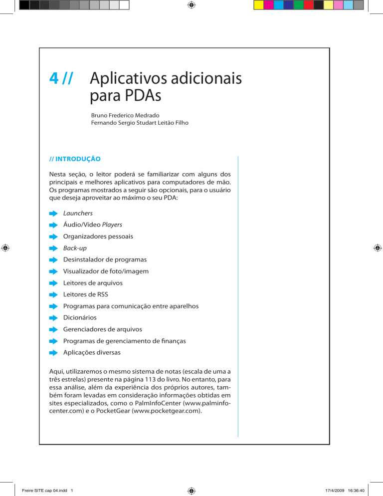 4 // Aplicativos adicionais para PDAs Bruno Frederico Medrado Fernando Sergio Studart Leitão Filho // INTRODUÇÃO Nesta seção, o leitor poderá se familiarizar com alguns dos principais e melhores aplicativos para computadores de mão. Os programas mostrados a seguir são opcionais, para o usuário que deseja aproveitar ao máximo o seu PDA: Launchers Áudio/Vídeo Players Organizadores pessoais Back-up Desinstalador de programas Visualizador de foto/imagem Leitores de arquivos Leitores de RSS Programas para comunicação entre aparelhos Dicionários Gerenciadores de arquivos Programas de gerenciamento de finanças Aplicações diversas Aqui, utilizaremos o mesmo sistema de notas (escala de uma a três estrelas) presente na página 113 do livro. No entanto, para essa análise, além da experiência dos próprios autores, também foram levadas em consideração informações obtidas em sites especializados, como o PalmInfoCenter (www.palminfocenter.com) e o PocketGear (www.pocketgear.com). Freire SITE cap 04.indd 1 17/4/2009 16:36:40 2 // Gestão do conhecimento médico // Launchers Aplicativos que permitem mudar a interface do Palm, oferecendo suporte para a instalação de temas (conjunto de ícones e papel de parede), utilização de menus, submenus e pastas, com criação de novos ícones, atalhos e comandos. // Zlauncher Launcher que contém muitas funções e temas, sendo, provavelmente, um dos mais completos nessa categoria (Figura 4.1). Nota: Licença: shareware Sistema operacional: Palm OS 3.5 ou superior Link do desenvolvedor: http://www.zztechs.com/ Existem programas similares, como o Winlauncher, o Launcher X, o Hi-Launcher, entre outros. // Áudio/Vídeo players Aplicativos que são utilizados para reprodução de músicas e/ou vídeos. // Pocket Tunes Com uma interface de fácil manuseio, esse programa reproduz áudio com ótima qualidade. Possui suporte para arquivos MP3, WMA, AAC, aacPlus e WAV. Também é possíFigura 4.1 // A) Tela mostrando um tema que faz a interface do Palm ficar semelhante à do iPhone. B) Outro exemplo de tema, mostrando utilização de abas na tela principal. (A) Freire SITE cap 04.indd 2 (B) 17/4/2009 16:36:40 aplicativos adicionais para pdas // 3 vel escutar rádios on-line caso haja conexão com a internet. Nota: Licença: shareware Sistema operacional: Palm OS 5.0 Link do desenvolvedor: http://www.pocket-tunes.com/ // Kinoma Player Programa bastante útil para a reprodução e visualização de vídeos, músicas e imagens. Possui suporte a grande diversidade de formatos e os processa com grande rapidez. Como diferencial, oferece a possibilidade de visualizar vídeos diretamente da internet, a partir de sites como Youtube (http: //www.youtube.com), e de escutar rádios on-line. Nota: Licença: shareware Sistema operacional: Palm OS 5.0 Link do desenvolvedor: http://www.kinoma.com/ // Organizadores pessoais // Agendus Palm OS Standard Edition Esse programa reúne, de forma eficiente, quatro dos principais utilitários do Palm: “Contatos”, “Calendário”, “Tarefas a fazer” e “Anotações”. Por meio dele, é possível, por exemplo, agendar uma tarefa com uma pessoa dos “Contatos” e, ainda, associar uma anotação a tal tarefa. Além disso, esse programa oferece vários outros recursos, como 16 formas diferentes de visualização do calendário, uso de ícones personalizáveis, histórico dos contatos, entre outros. Nota: Licença: shareware Sistema operacional: Palm OS 4 ou superior. Para suporte a imagens, exige Palm OS 5 ou superior. Também suporta Windows Mobile, Symbian OS e Blackberry Link do desenvolvedor: http://www.iambic.com/agendus/palmos/ // Back-up Programas que utilizam o cartão de memória para guardar cópias (back-ups) dos registros armazenados na memória inter- Freire SITE cap 04.indd 3 17/4/2009 16:36:40 4 // Gestão do conhecimento médico na do Palm, o que é essencial para se prevenir perda de dados. Nota: // NVBackup Licença: freeware Sistema operacional: Palm OS 5.0 Link do desenvolvedor: http://handypalmstuff.sourceforge.net/ // Resco Backup Um dos programas de back-up mais utilizado atualmente, possibilitando salvar informações específicas de modo isolado, como contatos e preferências (Figura 4.2). Nota: Licença: shareware Sistema operacional: Palm OS 5.0 ou Pocket PC Link do desenvolvedor: http://www.resco-net.com/ Figura 4.2 // A) Tela mostrando, em destaque, o botão para se fazer novo back-up (seta 1) e para se restaurar os registros do Palm a partir de back-up prévio (seta 2). B) Tela mostrando presença de diferentes perfis de back-up. 1 2 (A) (B) // Desinstalador de programas Indicados para desinstalação de aplicativos, permitindo a remoção adequada de arquivos e registros que em geral persistem após a desinstalação manual de programas. Isso evita que o computador trave em função de conflitos entre programas instalados e arquivos relacionados a programas já desinstalados. Freire SITE cap 04.indd 4 17/4/2009 16:36:41 aplicativos adicionais para pdas // 5 // Uninstall Manager Um dos poucos programas disponíveis atualmente que auxilia na remoção de arquivos durante a desinstalação de programas baseados em Palm OS. Sua interface é intuitiva e funcional. Nota: Licença: shareware Sistema operacional: Palm OS 5.0 Link do desenvolvedor: http://www.northglide.com/ // Visualizador de foto/imagem Abre arquivos de imagem em diversos formatos, permitindo, inclusive, reproduzir sequências de imagens (slideshow). // Resco Photo Viewer Representa um dos melhores programas dessa categoria, permitindo inúmeras opções para visualização e gerenciamento das imagens armazenadas (Figura 4.3). Nota: Licença: shareware Sistema operacional: Palm OS 5.0, Windows Mobile e Symbian OS Link do desenvolvedor: http://www.resconet.com/ Outra boa opção nessa categoria é o SplashPhoto ). (Nota Figura 4.3 // Tela mostrando a visualização de fotos em forma de miniaturas (thumbnails) no Resco P