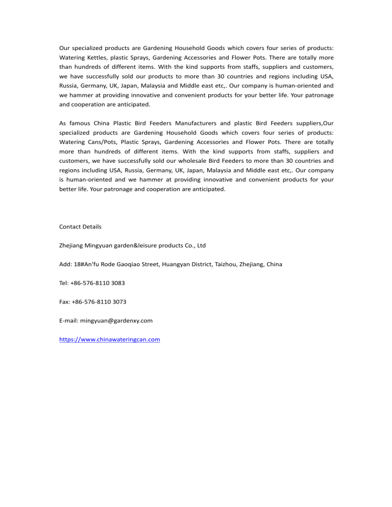 Our specialized products are Gardening Household Goods which covers four series of products: Watering Kettles, plastic Sprays, Gardening Accessories and Flower Pots. There are totally more than hundreds of different items. With the kind supports from staffs, suppliers and customers, we have successfully sold our products to more than 30 countries and regions including USA, Russia, Germany, UK, Japan, Malaysia and Middle east etc,. Our company is human-oriented and we hammer at providing innovative and convenient products for your better life. Your patronage and cooperation are anticipated. As famous China Plastic Bird Feeders Manufacturers and plastic Bird Feeders suppliers,Our specialized products are Gardening Household Goods which covers four series of products: Watering Cans/Pots, Plastic Sprays, Gardening Accessories and Flower Pots. There are totally more than hundreds of different items. With the kind supports from staffs, suppliers and customers, we have successfully sold our wholesale Bird Feeders to more than 30 countries and regions including USA, Russia, Germany, UK, Japan, Malaysia and Middle east etc,. Our company is human-oriented and we hammer at providing innovative and convenient products for your better life. Your patronage and cooperation are anticipated. Contact Details Zhejiang Mingyuan garden&leisure products Co., Ltd Add: 18#An'fu Rode Gaoqiao Street, Huangyan District, Taizhou, Zhejiang, China Tel: +86-576-8110 3083 Fax: +86-576-8110 3073 E-mail: [email protected] https://www.chinawateringcan.com