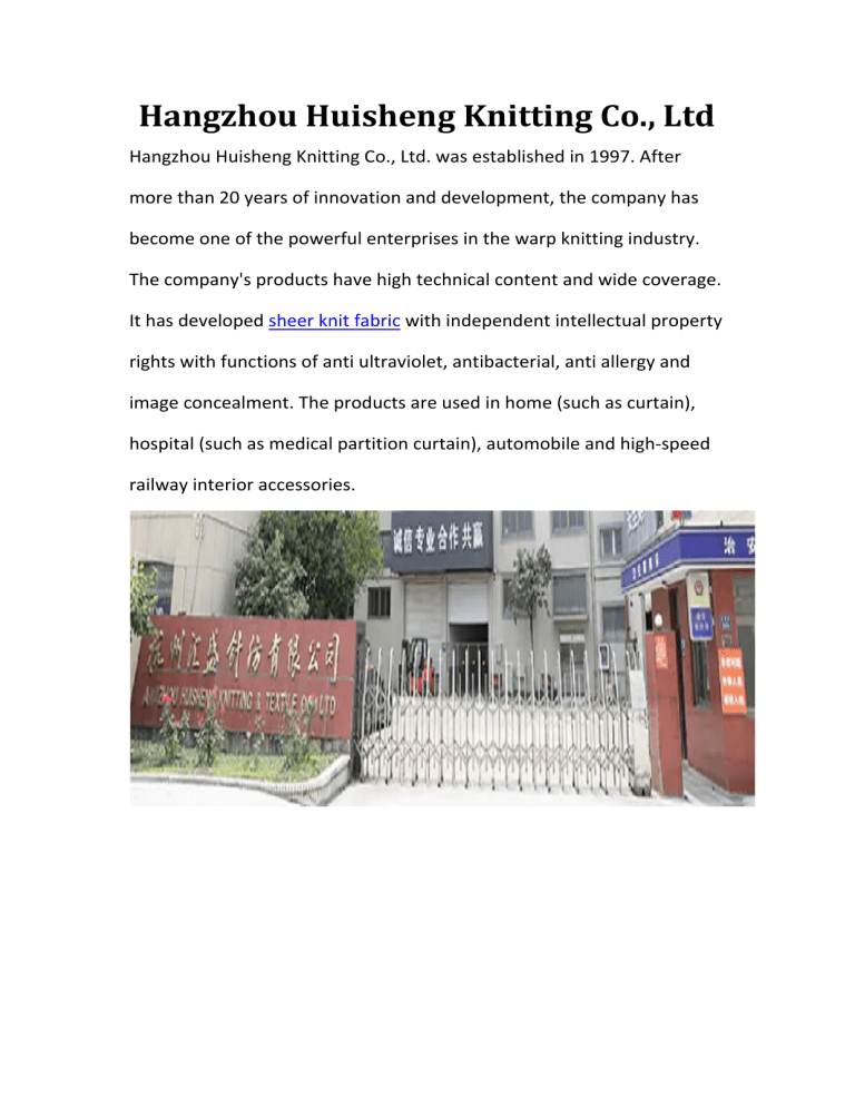 Hangzhou Huisheng Knitting Co., Ltd Hangzhou Huisheng Knitting Co., Ltd. was established in 1997. After more than 20 years of innovation and development, the company has become one of the powerful enterprises in the warp knitting industry. The company's products have high technical content and wide coverage. It has developed sheer knit fabric with independent intellectual property rights with functions of anti ultraviolet, antibacterial, anti allergy and image concealment. The products are used in home (such as curtain), hospital (such as medical partition curtain), automobile and high-speed railway interior accessories. Product Sheer fabrics pattern Sheer curtain fabric Door curtain Table cloth Contact us ADD:545 Yaqian Road, Hangzhou, Zhejiang, China TEL / FAX:+86-139 0671 6438/+86-571-8278-5096/0086-571-82782536 Email:[email protected] WEB:www.hzhszf.com