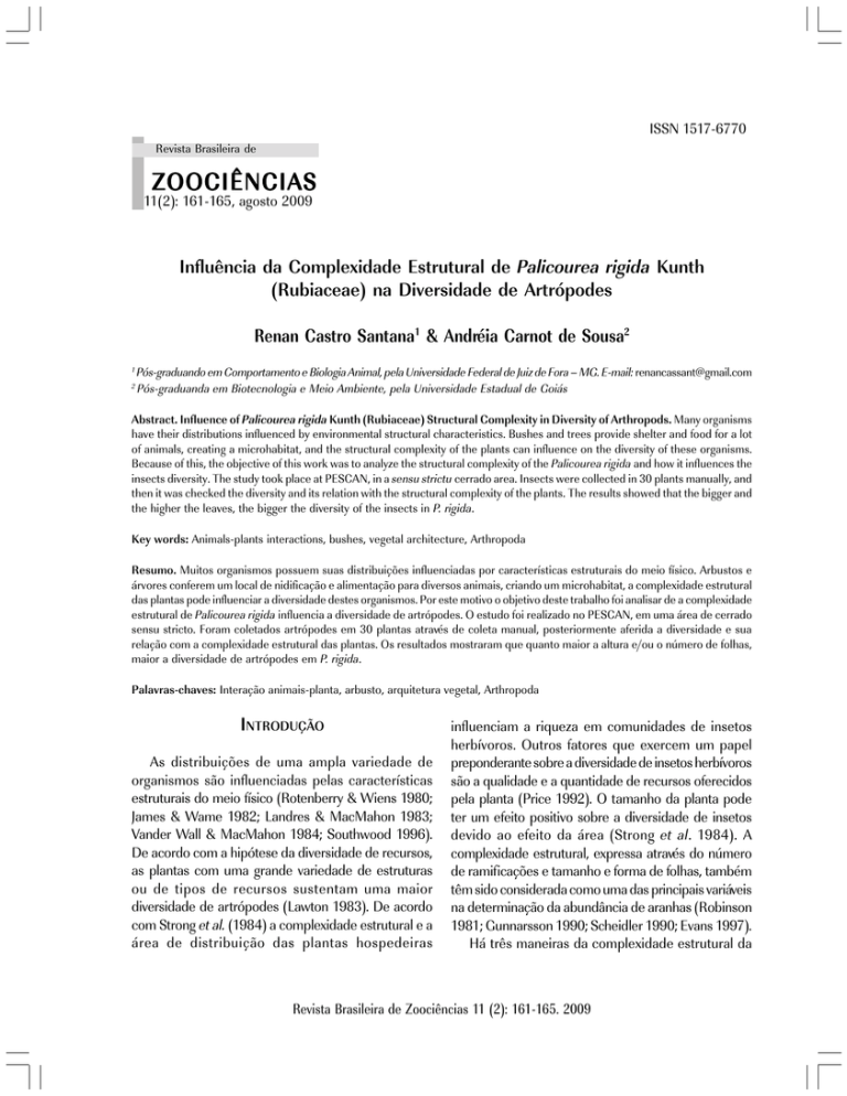 Influência de P. rigida na Diversidade de Artrópodes ISSN 1517-6770 Revista Brasileira de ZOOCIÊNCIAS 11(2): 161-165, agosto 2009 Influência da Complexidade Estrutural de Palicourea rigida Kunth (Rubiaceae) na Diversidade de Artrópodes Renan Castro Santana1 & Andréia Carnot de Sousa2 1 2 Pós-graduando em Comportamento e Biologia Animal, pela Universidade Federal de Juiz de Fora – MG. E-mail: [email protected] Pós-graduanda em Biotecnologia e Meio Ambiente, pela Universidade Estadual de Goiás Abstract. Influence of Palicourea rigida Kunth (Rubiaceae) Structural Complexity in Diversity of Arthropods. Many organisms have their distributions influenced by environmental structural characteristics. Bushes and trees provide shelter and food for a lot of animals, creating a microhabitat, and the structural complexity of the plants can influence on the diversity of these organisms. Because of this, the objective of this work was to analyze the structural complexity of the Palicourea rigida and how it influences the insects diversity. The study took place at PESCAN, in a sensu strictu cerrado area. Insects were collected in 30 plants manually, and then it was checked the diversity and its relation with the structural complexity of the plants. The results showed that the bigger and the higher the leaves, the bigger the diversity of the insects in P. rigida. Key words: Animals-plants interactions, bushes, vegetal architecture, Arthropoda Resumo. Muitos organismos possuem suas distribuições influenciadas por características estruturais do meio físico. Arbustos e árvores conferem um local de nidificação e alimentação para diversos animais, criando um microhabitat, a complexidade estrutural das plantas pode influenciar a diversidade destes organismos. Por este motivo o objetivo deste trabalho foi analisar de a complexidade estrutural de Palicourea rigida influencia a diversidade de artrópodes. O estudo foi realizado no PESCAN, em uma área de cerrado sensu stricto. Foram coletados artrópodes em 30 plantas através de coleta manual, posteriormente aferida a diversidade e sua relação com a complexidade estrutural das plantas. Os resultados mostraram que quanto maior a altura e/ou o número de folhas, maior a diversidade de artrópodes em P. rigida. Palavras-chaves: Interação animais-planta, arbusto, arquitetura vegetal, Arthropoda INTRODUÇÃO As distribuições de uma ampla variedade de organismos são influenciadas pelas características estruturais do meio físico (Rotenberry & Wiens 1980; James & Wame 1982; Landres & MacMahon 1983; Vander Wall & MacMahon 1984; Southwood 1996). De acordo com a hipótese da diversidade de recursos, as plantas com uma grande variedade de estruturas ou de tipos de recursos sustentam uma maior diversidade de artrópodes (Lawton 1983). De acordo com Strong et al. (1984) a complexidade estrutural e a área de distribuição das plantas hospedeiras influenciam a riqueza em comunidades de insetos herbívoros. Outros fatores que exercem um papel preponderante sobre a diversidade de insetos herbívoros são a qualidade e a quantidade de recursos oferecidos pela planta (Price 1992). O tamanho da planta pode ter um efeito positivo sobre a diversidade de insetos devido ao efeito da área (Strong et al. 1984). A complexidade estrutural, expressa através do número de ramificações e tamanho e forma de folhas, também têm sido considerada como uma das principais variáveis na determinação da abundância de aranhas (Robinson 1981; Gunnarsson 1990; Scheidler 1990; Evans 1997). Há três maneiras da complexidade estrutural da Revista Brasileira de Zoociências 11 (2): 161-165. 2009 .161 162. SANTANA & SOUSA planta influenciar a riqueza de espécies de herbívoros e aranhas: i) propiciando a criação de microhabitats em uma dada planta (Gonçalves-Alvim & Fernandes 2001); ii) suportando maiores populações e portanto reduzindo a probabilidade de extinção, e aumentando o encontro com parceiros sexuais; iii) provendo mais sítios de refúgio e permitindo a persistência de espécies mais suscetíveis à predação e a dessecação (Araujo et al. 2006; Souza 2007). Palicourea rígida (Rubiaceae) que pode ser encontrada como subarbusto ou arbusto de até 3 metros de altura com folhas simples, opostas, coriáceas, rígidas e grandes. Suas flores são amarelas ou alaranjadas, tubulosas, em panículas grandes, terminais com eixo amarelo ou avermelhado. Seus ramos são quadrangulares, suberosos, acinzentados e glabros. Floresce de outubro a janeiro e seu fruto é globoso e carnoso (Machado et al. 2005). Ocorre em toda região tropical da America do Sul, sendo comum no cerrado (Steyermark 1974). O objetivo deste trabalho foi averiguar a relação entre a complexidade estrutural de Palicourea rigida e a diversidade de artrópodes na planta. MATERIAL E MÉTODOS Área de estudo O estudo foi realizado no Parque Estadual da Serra de Caldas Novas (PESCAN), GO, que possui uma área de 12.500ha (17º49’33,5"S e 48º43’17,9"O) existindo varias fitofisionomias típicas do bioma Cerrado, como mata de galeria, cerradão, campo sujo, campo rupestre e cerrado sensu stricto. A amostragem foi restrita a uma área de cerrado sentido restrito, localizado no platô do parque a 932 metros de altitude, apresentando solo do tipo Latossolo Vermelho-Amarelo em relevo plano. O clima da região é do tipo Aw, segundo a classificação de Koppen (Lohmann 1993), caracterizado por apresentar inverno frio e seco e verão quente e chuvoso (Rosa et al. 1991). P. rigida é uma espécie abundante e facilmente encontrada no PESCAN. No período de coleta do presente trabalho a espécie encontrava-se em período reprodutivo. Por estas razões a espécie foi escolhida para averiguação da associação entre complexidade estrutural da planta e diversidade de artrópodes. Coleta de dados A coleta realizou-se durante o mês de novembro, na estação quente e úmida da região. O método empregado