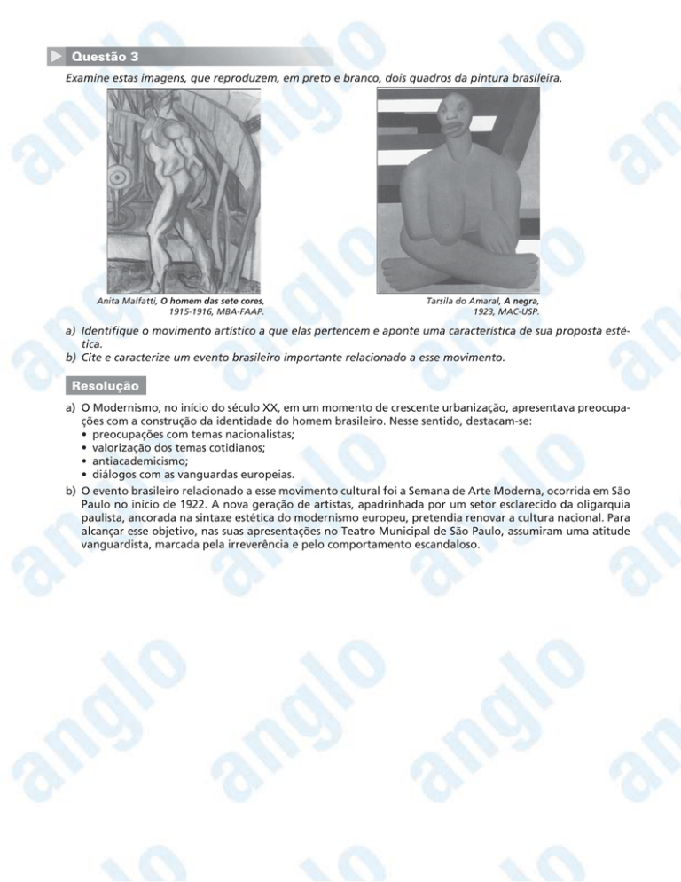 ▼ Questão 3 Examine estas imagens, que reproduzem, em preto e branco, dois quadros da pintura brasileira. Anita Malfatti, O homem das sete cores, 1915-1916, MBA-FAAP. Tarsila do Amaral, A negra, 1923, MAC-USP. a) Identifique o movimento artístico a que elas pertencem e aponte uma característica de sua proposta estética. b) Cite e caracterize um evento brasileiro importante relacionado a esse movimento. Resolução a) O Modernismo, no início do século XX, em um momento de crescente urbanização, apresentava preocupações com a construção da identidade do homem brasileiro. Nesse sentido, destacam-se: • preocupações com temas nacionalistas; • valorização dos temas cotidianos; • antiacademicismo; • diálogos com as vanguardas europeias. b) O evento brasileiro relacionado a esse movimento cultural foi a Semana de Arte Moderna, ocorrida em São Paulo no início de 1922. A nova geração de artistas, apadrinhada por um setor esclarecido da oligarquia paulista, ancorada na sintaxe estética do modernismo europeu, pretendia renovar a cultura nacional. Para alcançar esse objetivo, nas suas apresentações no Teatro Municipal de São Paulo, assumiram uma atitude vanguardista, marcada pela irreverência e pelo comportamento escandaloso.