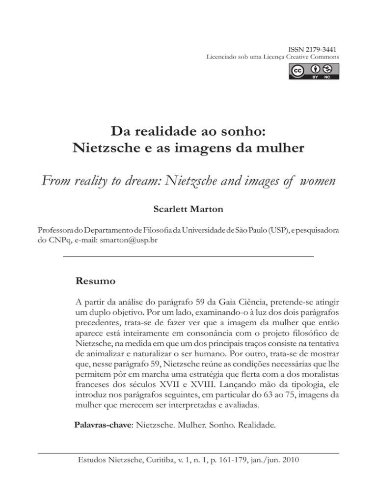 ISSN 2179-3441 Licenciado sob uma Licença Creative Commons (A) Da realidade ao sonho: Nietzsche e as imagens da mulher (I) From reality to dream: Nietzsche and images of women (A) Scarlett Marton Professora do Departamento de Filosofia da Universidade de São Paulo (USP), e pesquisadora do CNPq, e-mail: [email protected] (R) Resumo A partir da análise do parágrafo 59 da Gaia Ciência, pretende-se atingir um duplo objetivo. Por um lado, examinando-o à luz dos dois parágrafos precedentes, trata-se de fazer ver que a imagem da mulher que então aparece está inteiramente em consonância com o projeto filosófico de Nietzsche, na medida em que um dos principais traços consiste na tentativa de animalizar e naturalizar o ser humano. Por outro, trata-se de mostrar que, nesse parágrafo 59, Nietzsche reúne as condições necessárias que lhe permitem pôr em marcha uma estratégia que flerta com a dos moralistas franceses dos séculos XVII e XVIII. Lançando mão da tipologia, ele introduz nos parágrafos seguintes, em particular do 63 ao 75, imagens da mulher que merecem ser interpretadas e avaliadas. (P) Palavras-chave: Nietzsche. Mulher. Sonho. Realidade. (B) Estudos Nietzsche, Curitiba, v. 1, n. 1, p. 161-179, jan./jun. 2010 162 MARTON, S. Abstract Starting from an analysis of paragraph 59 of the Gay Science, we aim at a double goal. On the one hand, as we examine this paragraph on the light of the two previous ones, we will try to show that the image of woman, as it emerges from these texts, is in a complete accordance with Nietzsche’s philosophical project; for one of the main characteristics of it consists in an attempt to animalize and naturalize the human being. On the other hand, we will also try to show that Nietzsche is able to materialize a strategy which results sympathetic toward that one of the French moralists of the XVII and XVIII centuries. Based on this typology, he introduces in the next paragraphs, particularly from the 63th to the 75th paragraphs, other images of woman which require to be interpreted and evaluated. (K) Keywords: Nietzsche. Woman. Dream. Reality. Introdução As considerações de Nietzsche sobre a condição feminina foram, durante muito tempo, tomadas com precaução, seja por causa da misoginia que se julgava estar presente em seus textos, seja graças ao antifeminismo que se acreditava neles se manifestar. Revelava-se muito mais prudente, ao que parece, ignorar suas posições a respeito das mulheres assim como suas observações acerca do feminino. Nas duas últimas décadas, muitos são os escritos que se voltaram para essa questão; eles se situam sobretudo no contexto dos estudos feministas publicados em língua inglesa. De modo geral, duas têm sido as perspectivas adotadas: debater acerca das eventuais contribuições da filosofia nietzscheana para as discussões feministas1 e discutir como interpretar as observações de Nietzsche a propósito das mulheres. E, no afã de lidar com as considerações que o filósofo faz sobre a condição feminina, há tanto quem advogue a ideia de que a sua escrita é feminina2 quanto quem 1 Cf. a propósito ACKERMAN, 1990; ANSELL-PEARSON, 1992; PATTON, 1993; OLIVER, 1995; OLIVER; PEARSALL, 1998. 2 Cf. KRELL, 1986. Estudos Nietzsche, Curitiba, v. 1, n. 1, p. 161-179, jan./jun. 2010 Da realidade e do sonho 163 defenda a posição de que ele é antifeminista.3 Há também quem afirme que se deveria estender à sociedade patriarcal a crítica radical que o autor de Zaratustra faz do racionalismo, do cientificismo, do positivismo, em suma, da cultura ocidental,4 e quem sustente que o pensamento nietzscheano oferece uma oportunidade de releitura do cânon filosófico em voga, cânon esse que sempre negou e excluiu de seu horizonte de reflexão as mulheres e o feminino (OLIVER, 1995). Adotando um ponto de vista demasiado específico, escritos feministas se atêm, no mais das vezes, a polêmicas localizadas. Por demais marcados pelo tempo e pelo espaço em que surgem, respondem, com frequência, a interesses pontuais. Importa notar, porém, que muitos deles tomam como ponto de partida, tanto na França quanto na Inglaterra e nos Estados Unidos, a leitura desconstrutivista inaugurada por Derrida. Em Éperons: les styles de Nietzsche, livro publicado em 1978, o pensador francês fez um uso metafórico da “mulher”, uso esse que inspirou vários trabalhos. Mais recentemente, seguindo a trilha por ele aberta, Sarah Kofman e Luce Irigaray contribuíram com seus estudos para que leituras feministas tomassem Nietzsche por um valioso interlocutor. Contudo, não se trata, aqui, de examinar e avaliar escritos feministas. Tal tarefa ultrapassaria em muito o quadro e o objetivo desta intervenção. Prefiro voltar-me para o próprio texto nietzscheano e analisar uma sequência de parágrafos do segundo livro da Gaia Ciência. E procurarei fazê-lo em três tempos. Sobre a articulação interna da sequência dos parágrafos que se encontram entre o 57º e o 75º da Gaia Ciência A partir do exame atento desses textos, é possível neles detectar e trazer à luz certa estrutura. Vista de perto, ela é comparável à estrutura presente numa outra sequência de parágrafos: os que se acham entre o 230º e o 239º do capítulo intitulado “Nossas virtudes” de Para além de bem e mal (OLIVER, 1995). 3 Cf. SCHUTTE, 1984. 4 É o que defende, por exemplo, Debra Bergoffen no seu artigo “On the advantage and disadvantage of Nietzsche for women” (1989, p.77). Estudos Nietzsche, Curitiba, v. 1, n. 1, p. 161-179, jan./jun. 2010 164 MARTON, S. No parágrafo 230 desse livro, Nietzsche expressa sua exigência de “reconverter o homem para a natureza; triunfar sobre as muitas interpretações e segundos sentidos vaidosos e delirantes que agora foram rabiscados e pintados sobre aquele eterno texto fundamental homo natura” (ABM 230).5 Não é por julgar existir uma natureza humana que ele clama a que se naturalize o homem; não é
