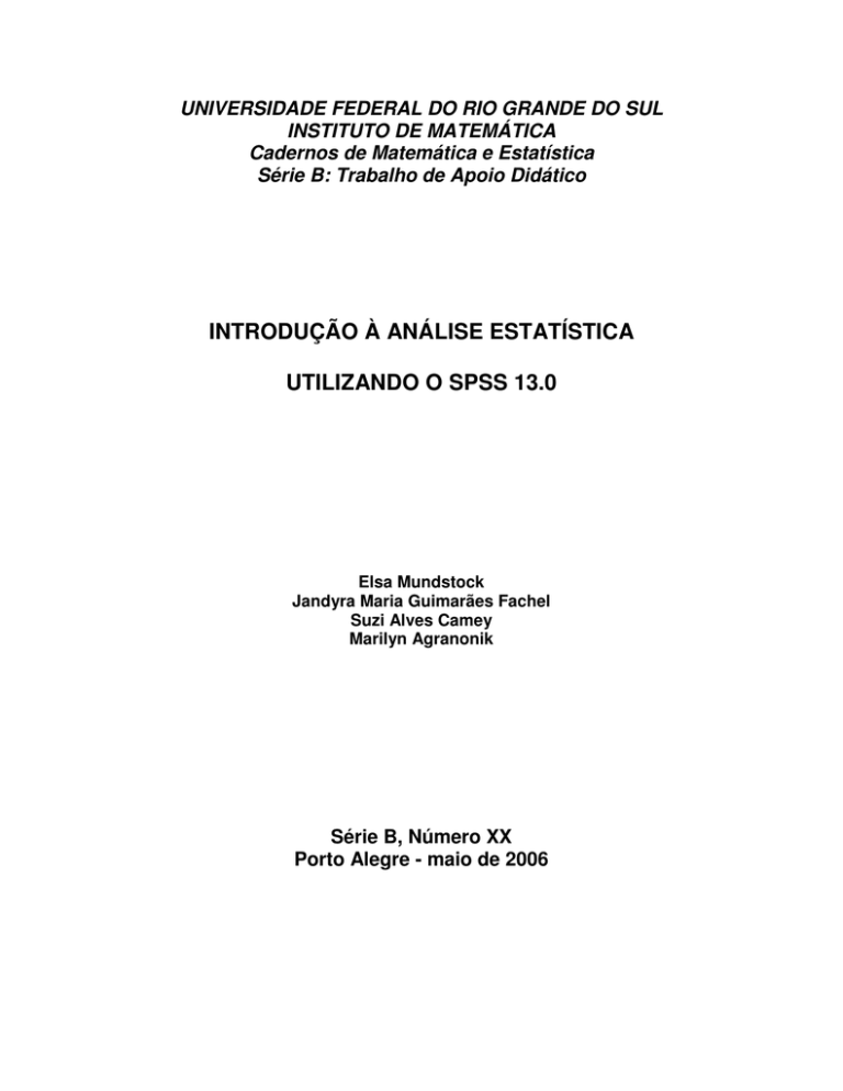 UNIVERSIDADE FEDERAL DO RIO GRANDE DO SUL INSTITUTO DE MATEMÁTICA Cadernos de Matemática e Estatística Série B: Trabalho de Apoio Didático INTRODUÇÃO À ANÁLISE ESTATÍSTICA UTILIZANDO O SPSS 13.0 Elsa Mundstock Jandyra Maria Guimarães Fachel Suzi Alves Camey Marilyn Agranonik Série B, Número XX Porto Alegre - maio de 2006 ÍNDICE 1. INTRODUÇÃO AO SPSS ........................................................................................................ 3 1.1 - BANCO DE DADOS: Definição ............................................................................... 4 1.2 - COMO CRIAR UM BANCO DE DADOS................................................................. 4 1.3 - COMO DAR NOME AOS NÍVEIS DE UMA VARIÁVEL ......................................... 5 1.4 - COMO ACESSAR UM BANCO DE DADOS JÁ EXISTENTE ................................ 6 2. INTRODUÇÃO AOS MÉTODOS ESTATÍSTICOS.................................................................. 7 2.1 - TIPOS DE VARIÁVEIS: Definição........................................................................... 7 2.2 - DESCRIÇÃO E EXPLORAÇÃO DE DADOS.......................................................... 7 2.3 - CATEGORIZAÇÃO DE VARIÁVEIS ....................................................................... 8 2.3.1 - COMO CATEGORIZAR UMA VARIÁVEL QUANTITATIVA................................ 8 2.3.2 - COMO DAR NOME AOS NÍVEIS DE UMA VARIÁVEL .................................... 10 2.4 - COMO CRIAR UMA VARIÁVEL A PARTIR DE UMA DATA................................ 10 2.5 - COMO CRIAR UMA VARIÁVEL ATRAVÉS DA COMBINAÇÃO DE OUTRAS DUAS ............................................................................................................................. 10 3. ANÁLISE UNIVARIADA ......................................................................................................... 12 3.1 - VARIÁVEIS QUANTITATIVAS .............................................................................. 12 3.1.1 - COMO OBTER AS ESTATÍSTICAS DESCRITIVAS ......................................... 12 3.1.2 - COMO OBTER UM HISTOGRAMA ................................................................... 12 3.2 - VARIÁVEIS CATEGÓRICAS (QUALITATIVAS)................................................... 13 3.2.1 - COMO OBTER A DISTRIBUIÇÃO DE FREQÜÊNCIAS ................................... 13 3.2.2 - COMO OBTER GRÁFICOS ............................................................................... 14 4. ANÁLISE BIVARIADA ............................................................................................................ 16 4.1 - VARIÁVEIS QUANTITATIVAS X QUANTITATIVAS............................................. 16 4.1.1 - COMO CALCULAR A CORRELAÇÃO ENTRE DUAS VARIÁVEIS QUANTITATIVAS........................................................................................................... 16 4.1.2 - COMO OBTER GRÁFICO DE PONTOS (SCATTERPLOT) ................. 16 4.1.3 - COMO OBTER O COEFICIENTE DE CORRELAÇÃO DE PEARSON ............ 18 4.1.4 - COMO FAZER REGRESSÃO LINEAR SIMPLES............................................. 19 4.2 - VARIÁVEIS CATEGÓRICAS X CATEGÓRICAS ................................................. 22 4.2.1 - COMO VERIFICAR A EXISTÊNCIA DE ASSOCIAÇÃO ENTRE VARIÁVEIS CATEGÓRICAS: Teste Qui - Quadrado........................................................................ 23 4.2.2 - COMO CALCULAR OS RESÍDUOS AJUSTADOS ........................................... 26 4.3 - VARIÁVEIS QUANTITATIVAS X CATEGÓRICAS ............................................... 27 4.3.1 - COMO FAZER O BOX-PLOT............................................................................. 28 5. COMPARAÇÃO DE MÉDIAS................................................................................................. 31 5.1 - COMO COMPARAR MÉDIAS ENTRE DOIS GRUPOS: Teste “t” para Amostras Independentes. .............................................................................................................. 31 5.2 - COMO COMPARAR AS MÉDIAS DE TRES OU MAIS GRUPOS: Análise de Variância – “ANOVA” para um fator” ............................................................................. 33 7. MANIPULAÇÃO DE DADOS ................................................................................................. 36 7.1 SORT CASES.......................................................................................................... 36 7.2 SELECT CASES...................................................................................................... 37 7.3 SPLIT FILE............................................................................................................... 39 7.4 MANIPULAÇÃO DE ARQUIVOS............................................................................. 41 7.5 COMO APAGAR ANÁLISES NÃO DESEJADAS NO ARQUIVO DE RESULTADOS “*.spo”............................................................................................................................. 41 7.6 COMO REALIZAR ALTERAÇÕES DE DADOS PARA CONSTRUÇÃO DE GRÁFICO....................................................................................................................... 41 8. ESTATÍSTICA NÃO PARAMÉTRICA .................................................................................... 43 8.1 TESTE DE KOLMOGOROV-SMIRNOV.................................................................. 43 9. AMOSTRAGEM...................................................................................................................... 45 2 1. INTRODUÇÃO AO SPSS O pacote estatístico SPSS (Statistical Package for Social Sciences) é uma ferramenta para análise de dados utilizando técnicas estatísticas básicas e avançadas. É um software estatístico de fácil manuseio internacionalmente utilizado há muitas décadas, desde suas versões para computadores de grande porte. Tela inicial