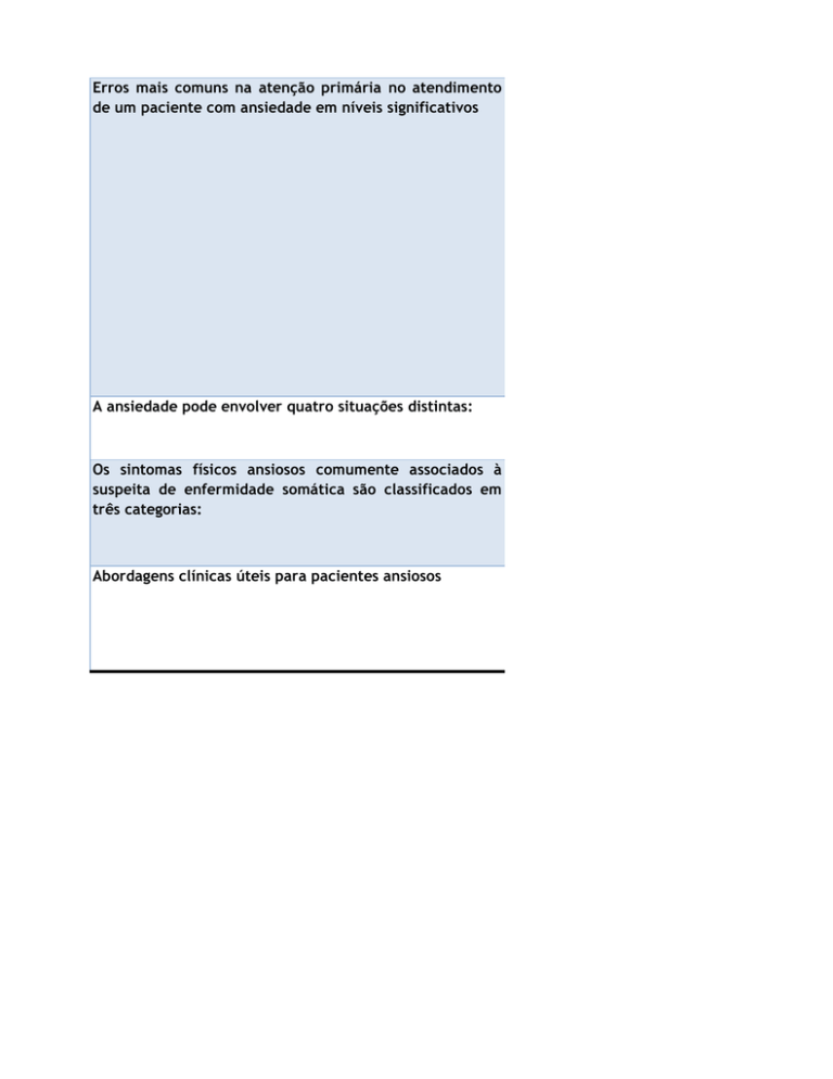 Erros mais comuns na atenção primária no atendimento de um paciente com ansiedade em níveis significativos A ansiedade pode envolver quatro situações distintas: Os sintomas físicos ansiosos comumente associados à suspeita de enfermidade somática são classificados em três categorias: Abordagens clínicas úteis para pacientes ansiosos 1. Considerar rapidamente a ansiedade como problema psiquiátrico e encaminhar o paciente para um profissional de saúde mental prematuramente, ou apressar-se em prescrever um benzodiazepínico. O tratamento de rotina da ansiedade com benzodiazepínicos não é mais apropriado que o tratamento rotineiro da febre com penicilina. A ansiedade é habitualmente tratada como o diagnóstico, ao invés de um sinal para se buscar a fonte da ansiedade ou para se tentar compreender seu significado. Se a ansiedade for um sintoma de uma doença clínica somática ou parte de uma reação de ajustamento do paciente a ela, o profissional de saúde deve conversar mais especificamente com o paciente sobre seus sentimentos. a) ansiedade como uma resposta normal de alerta à ameaça percebida de enfermidade médica e intervenções de tratamento; tensão motora: tremores, espasmos, tensão ou dores musculares, inquietação, fadiga fácil; ouvir, de forma calma, responsiva, não direta; sem pressa para resolver o problema; 2. O profissional de saúde da atenção primária pode pressupor que sabe por que o paciente “está” ansioso. Um exemplo clássico é assumir que o paciente que será submetido a um tratamento com quimioterapia está mais preocupado com os efeitos colaterais potencialmente graves do que, por exemplo, com a perda dos cabelos (imediatamente mais grave para esse paciente em particular). b) ansiedade como uma manifestação sintomática de enfermidade clínica somática, de ordem endócrina, cardíaca, pulmonar ou neurológica; hiperatividade autonômica: falta de ar ou sufocação, palpitações ou taquicardia, sudorese ou mãos úmidas, boca seca, tonturas ou vertigens, náuseas, diarreia, calorões ou arrepios, polaciúria, dificuldade de deglutir; explorar o significado do adoecer para o paciente; 3. O profissional de saúde da atenção primária pode apressar-se em acalmar o paciente, dizendo-lhe que “não há nada a temer”. Tal afirmativa pode, de fato, aumentar a ansiedade do paciente, que pode sentir que o profissional de saúde não está levando suas preocupações a sério. Em vez disso, tal profissional de saúde deve garantir o suporte contínuo e a monitorização cuidadosa da causa de sua ansiedade. c) ansiedade como um sintoma de intoxicação ou síndrome de abstinência; hipervigilância/ hiperalerta: dificuldade de concentração, “branco na cabeça”, irritabilidade, sobressalto, nervosismo, dificuldades em adormecer e manter o sono. direcionar as razões conscientes para a ansiedade por orientação direta, enquanto continua a ouvir outras preocupações; d) ansiedade como sintoma de um transtorno psiquiátrico qualquer, além dos transtornos ansiosos e depressivos, nos quais geralmente está presente. compreender que pode ser difícil para o paciente identificar a causa imediata da ansiedade, mas que a vontade do profissional de avaliar se a ansiedade está fora de proporção com a situação e considerar consulta psiquiátrica; oferecer suporte, por meio de conversas continuadas, seguimento pela rede natural de apoio psicossocial, tentando abordar preocupações no momento que são identificadas, e considerar abordagens farmacológicas quando indicadas.