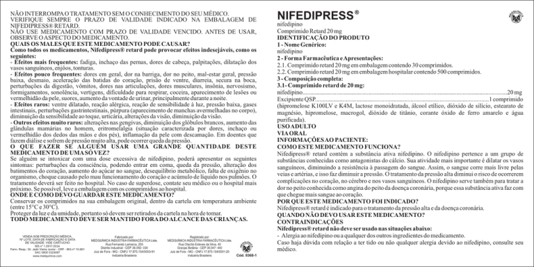 NÃO INTERROMPA O TRATAMENTO SEM O CONHECIMENTO DO SEU MÉDICO. VERIFIQUE SEMPRE O PRAZO DE VALIDADE INDICADO NA EMBALAGEM DE NIFEDIPRESS® RETARD. NÃO USE MEDICAMENTO COM PRAZO DE VALIDADE VENCIDO. ANTES DE USAR, OBSERVE O ASPECTO DO MEDICAMENTO. QUAIS OS MALES QUE ESTE MEDICAMENTO PODE CAUSAR? Como todos os medicamentos, Nifedipress® retard pode provocar efeitos indesejáveis, como os seguintes: - Efeitos mais frequentes: fadiga, inchaço das pernas, dores de cabeça, palpitações, dilatação dos vasos sanguíneos, enjôos, tonturas. - Efeitos pouco frequentes: dores em geral, dor na barriga, dor no peito, mal-estar geral, pressão baixa, desmaio, aceleração das batidas do coração, prisão de ventre, diarreia, secura na boca, perturbações da digestão, vômitos, dores nas articulações, dores musculares, insônia, nervosismo, formigamentos, sonolência, vertigens, dificuldade para respirar, coceira, aparecimento de lesões ou vermelhidão da pele, suores, aumento da vontade de urinar, principalmente durante a noite. - Efeitos raros: ventre dilatado, reação alérgica, reação de sensibilidade à luz, pressão baixa, gases intestinais, perturbações gastrintestinais, púrpura (aparecimento de manchas avermelhadas no corpo), diminuição da sensibilidade ao toque, urticária, alterações da visão, diminuição da visão. - Outros efeitos muito raros: alterações nas gengivas, diminuição dos glóbulos brancos, aumento das glândulas mamárias no homem, eritromelalgia (situação caracterizada por dores, inchaço ou vermelhidão dos dedos das mãos e dos pés), inflamação da pele com descamação. Em doentes que fazem diálise e sofrem de pressão muito alta, pode ocorrer queda da pressão. O QUE FAZER SE ALGUÉM USAR UMA GRANDE QUANTIDADE DESTE MEDICAMENTO DE UMA SÓ VEZ? Se alguém se intoxicar com uma dose excessiva de nifedipino, poderá apresentar os seguintes sintomas: perturbações da consciência, podendo entrar em coma, queda da pressão, alteração dos batimentos do coração, aumento do açúcar no sangue, desequilíbrio metabólico, falta de oxigênio no organismo, choque causado pelo mau funcionamento do coração e acúmulo de líquido nos pulmões. O tratamento deverá ser feito no hospital. No caso de superdose, contate seu médico ou o hospital mais próximo. Se possível, leve a embalagem com os comprimidos ao hospital. ONDE E COMO DEVO GUARDAR ESTE MEDICAMENTO? Conservar os comprimidos na sua embalagem original, dentro da cartela em temperatura ambiente (entre 15°C e 30°C). Proteger da luz e da umidade, portanto só devem ser retirados da cartela na hora de tomar. TODO MEDICAMENTO DEVE SER MANTIDO FORA DO ALCANCE DAS CRIANÇAS. VENDA SOB PRESCRIÇÃO MÉDICA. Nº LOTE, DATA DE FABRICAÇÃO E DATA DE VALIDADE: VIDE CARTUCHO MS nº 1.0917.0034 Farm. Resp.: Dr. Jadir Vieira Junior - CRF - MG nº 10.681 SAC 0800 0324087 www.medquimica.com Fabricado por: MEDQUÍMICA INDÚSTRIA FARMACÊUTICA Ltda. Rua Fernando Lamarca, 255 Distrito Industrial - CEP 36.092- 030 Juiz de Fora - MG - CNPJ 17.875.154/0003-91 Indústria Brasileira Registrado por: MEDQUÍMICA INDÚSTRIA FARMACÊUTICA Ltda. Rua Otacílio Esteves da Silva, 40 Granjas Betânia - CEP 36.047- 400 Juiz de Fora - MG - CNPJ 17.875.154/0001-20 Indústria Brasileira Cód. 9368-1 NIFEDIPRESS nifedipino Comprimido Retard 20 mg IDENTIFICAÇÃO DO PRODUTO 1 - Nome Genérico: nifedipino 2 - Forma Farmacêutica e Apresentações: 2.1. Comprimido retard 20 mg em embalagem contendo 30 comprimidos. 2.2. Comprimido retard 20 mg em embalagem hospitalar contendo 500 comprimidos. 3 - Composição completa: 3.1- Comprimido retard de 20 mg: nifedipino.....................................................................................................................................20 mg Excipiente QSP.................................................................................................................1 comprimido (hipromelose K100LV e K4M, lactose monoidratada, álcool etílico, dióxido de silício, estearato de magnésio, hipromelose, macrogol, dióxido de titânio, corante óxido de ferro amarelo e água purificada). USO ADULTO VIA ORAL INFORMAÇÕES AO PACIENTE: COMO ESTE MEDICAMENTO FUNCIONA? Nifedipress® retard contém a substância ativa nifedipino. O nifedipino pertence a um grupo de substâncias conhecidas como antagonistas do cálcio. Sua atividade mais importante é dilatar os vasos sanguíneos, diminuindo a resistência à passagem do sangue. Assim, o sangue corre mais livre pelas veias e artérias, e isso faz diminuir a pressão. O tratamento da pressão alta diminui o risco de ocorrerem complicações no coração, no cérebro e nos vasos sanguíneos. O nifedipino serve também para tratar a dor no peito conhecida como angina do peito da doença coronária, porque essa substância ativa faz com que chegue mais sangue ao coração. POR QUE ESTE MEDICAMENTO FOI INDICADO? Nifedipress® retard é indicado para o tratamento da pressão alta e da doença coronária. QUANDO NÃO DEVO USAR ESTE MEDICAMENTO? CONTRAINDICAÇÕES Nifedipress® retard não deve ser usado nas situações abaixo: - Alergia ao nifedipino ou a qualquer dos outros ingredientes do medicamento. Caso haja dúvida com relação a ter tido ou não qualquer alergia devido ao nifedipino, consulte seu médico. - Em caso de choque de origem cardíaca. - Paciente fazendo uso do antibiótico rifampicina, que é um medicamento que combate infecções. - Durante a gravidez e a amamentação, exceto sob orientação médica. Informe ao seu médico caso ocorra gravidez ou início de amamentação durante o uso deste medicamento. ESTE MEDICAMENTO É CONTRAINDICADO PARA CRIANÇAS E ADOLESCENTES. ADVERTÊNCIAS Nifedipress® retard deve ser usado com precaução nos seguintes casos: - Pacientes que sofrem de pressão muito baixa ou de mau funcionamento do coração, o que os médicos chamam de insuficiência cardíaca, ou pessoas que tenham est